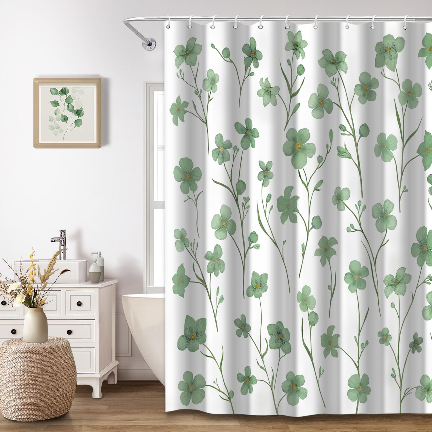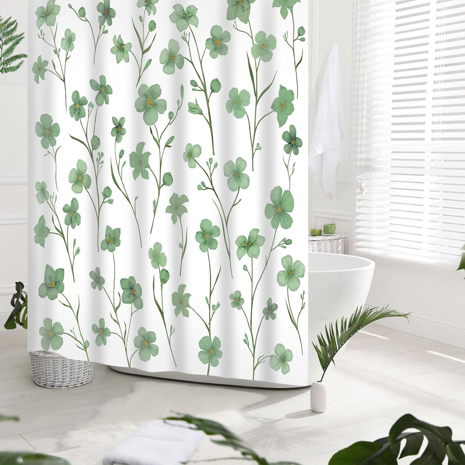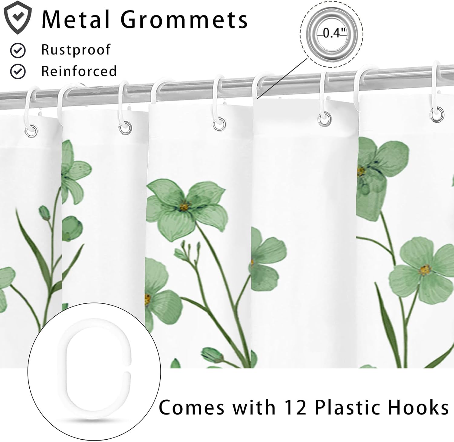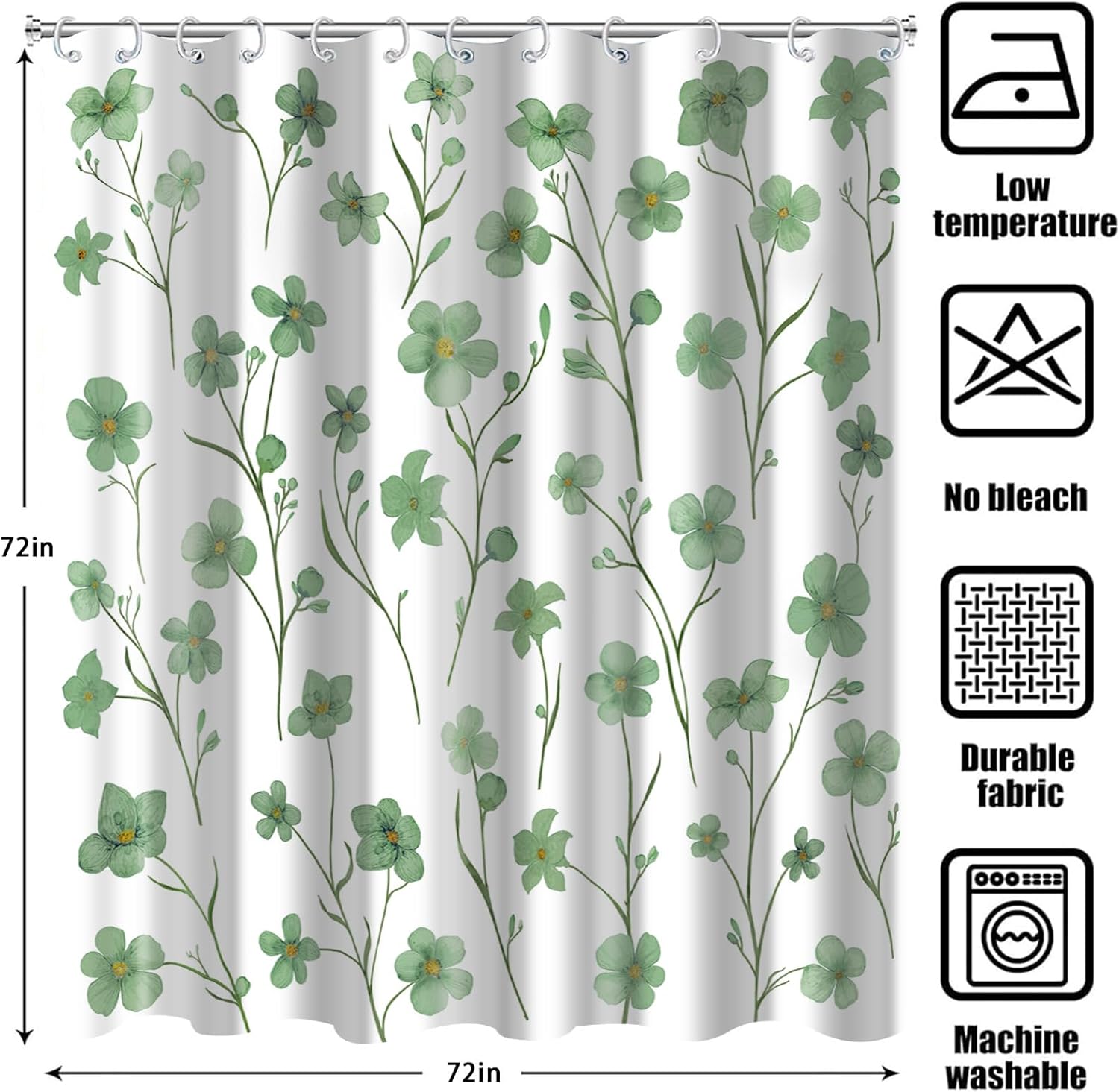Floral Shower Curtain, Sage Green Spring Flower Watercolor Design, Modern Printed Waterproof Bathroom Curtain with 12 Hooks, 72×72