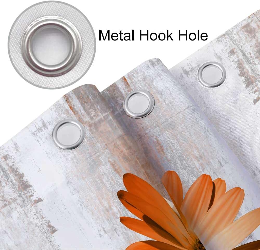 Rustic Farmhouse Shower Curtain, Orange Daisy Floral and Butterfly Design on Country Wooden Background, Autumn Bathroom Curtain with 12 Hooks, Yellow Grey Red Gold, 72×72 Inches
